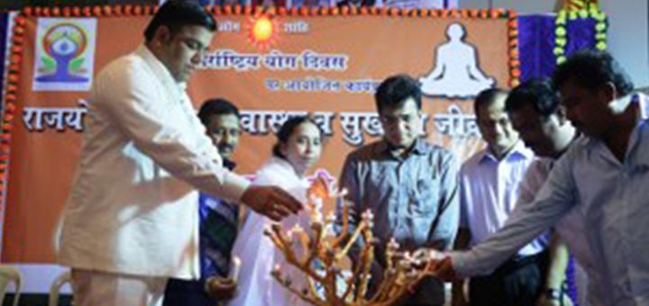 Grand celebrations of the 3rd International Day of Yoga organised jointly by Patanjali Yog Samiti, Nehru Yuva Kendra and BJP Panaji Mandal at Taleigao Community Centre in the capital city of Panaji. Candle-lighting ceremony along with Rajyogini Vanita and other dignitaries....